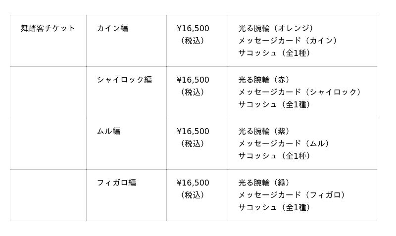 舞踏客チケット……パーティの招待客として、キャストに話しかけられることがあります。公演中は購入時に選択した魔法使いに固定でついていくことになります。