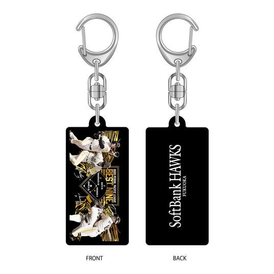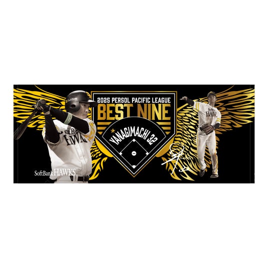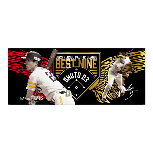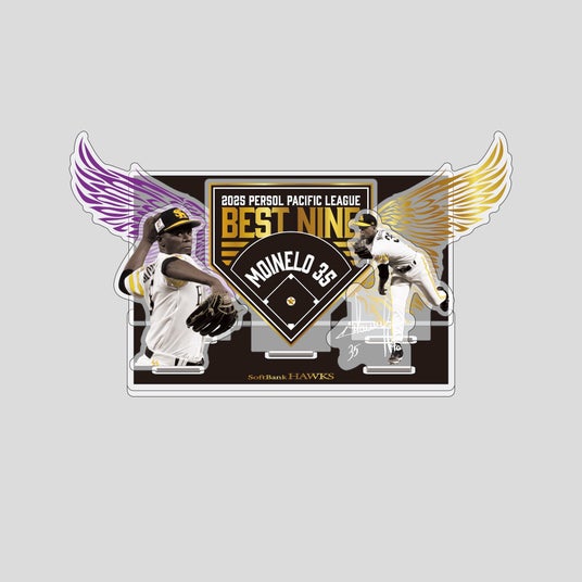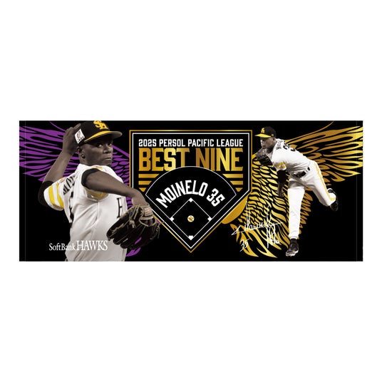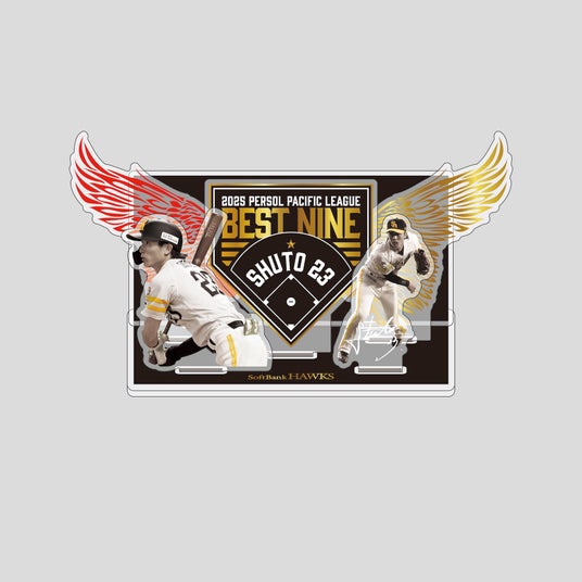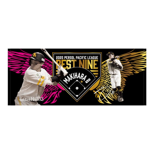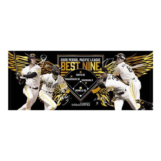 2025年度「ベストナイン賞」の受賞選手が11月25日(火)に発表され、ホークスからは投手部門でモイネロ投手、二塁手部門で牧原大成選手、外野手部門で柳町達選手、周東佑京選手が選出されました。記念グッズは、大きく羽ばたく鷹の翼をモチーフに、今シーズンの選手たちの活躍を表現しました。