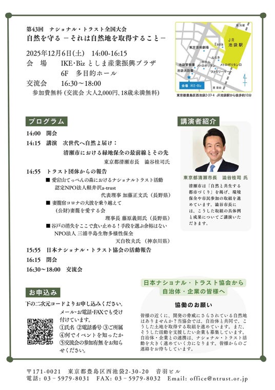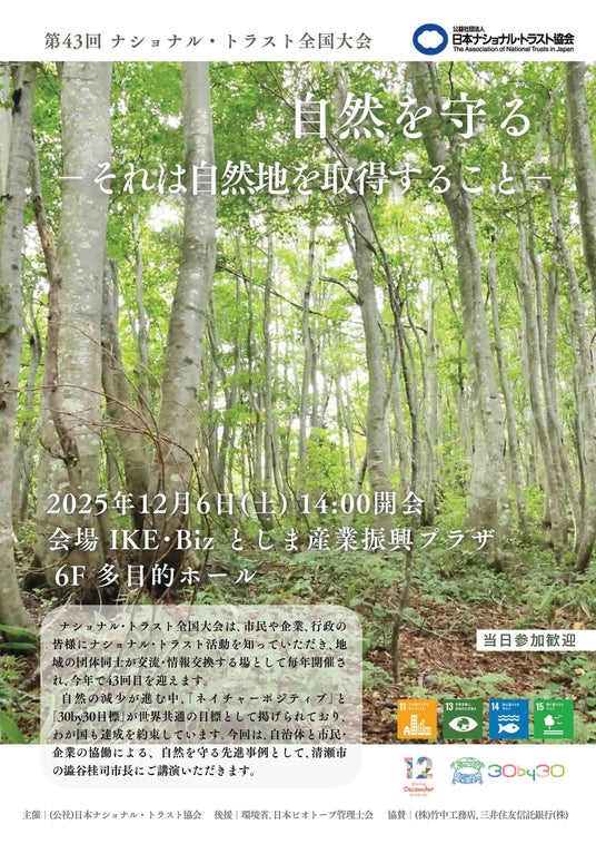 当協会の推進する「ナショナル・トラスト」は、まさに寄付によって地域の大切な自然を守る活動です。12月6日(土)、東京都豊島区西池袋のIKE・Bizにて「第43回 ナショナル・トラスト全国大会 自然を守る -それは自然地を取得すること-」を開催します。このイベントでは、寄付の大切さや「ナショナル・トラスト」を知らない人にもこの活動に親しんでいただける内容となっています。どなたでもご参加いただけます。多くの皆様のご参加をお待ちしています。
