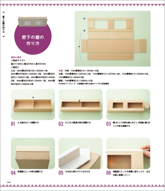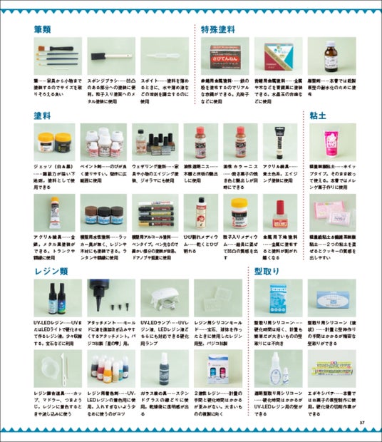 基本の床の土台の作り方、ドアのある床の作り方、女の子の部屋の壁の作り方(正面)、女の子の部屋の壁の作り方(左側面)、男の子の部屋の壁の作り方(正面) 、男の子の部屋の壁の作り方(左側面)、魔法の部屋の壁の作り方(側面) 、ステップラダーの作り方、カウンターテーブルの作り方、標本額の作り方、標本箱の作り方、蝶の標本の作り方、植物の標本の作り方、壁飾り用額の作り方、宝石ペンダントの作り方、石の作り方、ランタンの作り方、光る水晶玉の作り方、試験管立ての作り方、標本瓶大の作り方、ハーバリウムの作り方、サムネイルケースの作り方、標本瓶とお菓子ポットの作り方、杖の作り方、メタルポットの作り方、天秤の作り方、本の作り方、 羽根ペンの作り方、本棚の作り方、アイアン風吊り戸の作り方、キャンバスの作り方、絵画用額の作り方、イーゼルの作り方、コルクボードの作り方、絵の具の作り方、筆の作り方、パレットの作り方、電気スタンドの作り方、画箱の作り方、メタルトランクの作り方、筆洗器の作り方、ブックエンドの作り方、ベンチの作り方、丸椅子の作り方、ヘリンボーンテーブルの作り方、レンガの棚の作り方、窓下の棚の作り方、はめ込み棚の作り方、額棚の作り方、窓の作り方、着せ替えドアの作り方、ドライフラワー飾りの作り方、パーテーションの作り方、椅子の作り方、コンソールテーブルの作り方、テーブルの作り方、ステンドグラスの作り方、ステンドグラス額(小)の作り方、ステンドグラス額(大)の作り方、メレンゲの作り方、キャニスターの作り方、クッキー&グミの作り方、お菓子の箱の作り方、リースの作り方、望遠鏡の作り方、原石の作り方、光る原石の作り方、宝箱の作り方、コインの作り方、「冒険の部屋」の作り方