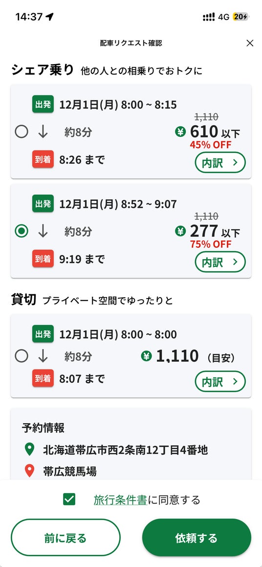 今回のアップデートによって予約の際に『シェア乗り』か『貸切』かを選択できるようになりました。