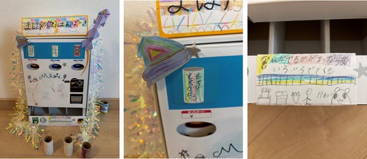 親子で楽しく遊びながら、自動販売機の仕組みを学べるように工夫しました。暑い日の登校時に“飲み物があったらいいな”という思いから、リュック型(ランドセル型)の自動販売機を考案しました。アルミホイルで作った“太陽光パネル”でエコにも配慮し、廃材の段ボールも活用しています。作品にはリサイクルの呼びかけや、「みんなできるようにね」というメッセージも添えています。