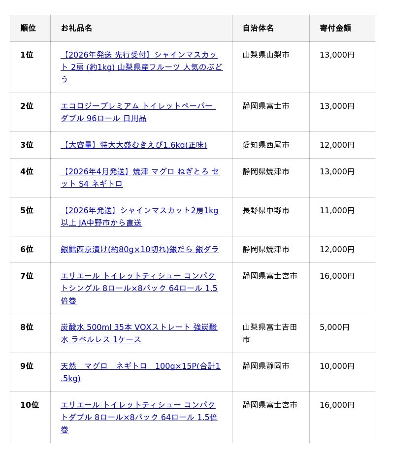 2025年全国版人気お礼品ランキング(速報)は以下よりご確認ください。