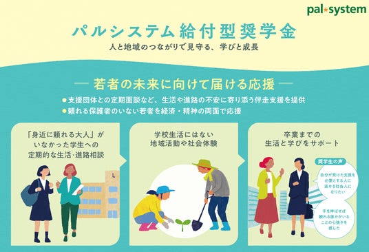 パルシステムの奨学金制度は、利用者から寄せられた募金から、対象の学生に毎月4万円の奨学金を給付します。奨学生を推薦する支援団体は、「伴走型支援」として、生活相談をはじめ精神的にも卒業までの学生生活をサポートします。パルシステムは、産直提携先での農業やボランティアなど社会体験プログラムを用意し、学業以外の経験を重ね、多様な人たちとのつながりを広げる機会を提供します。