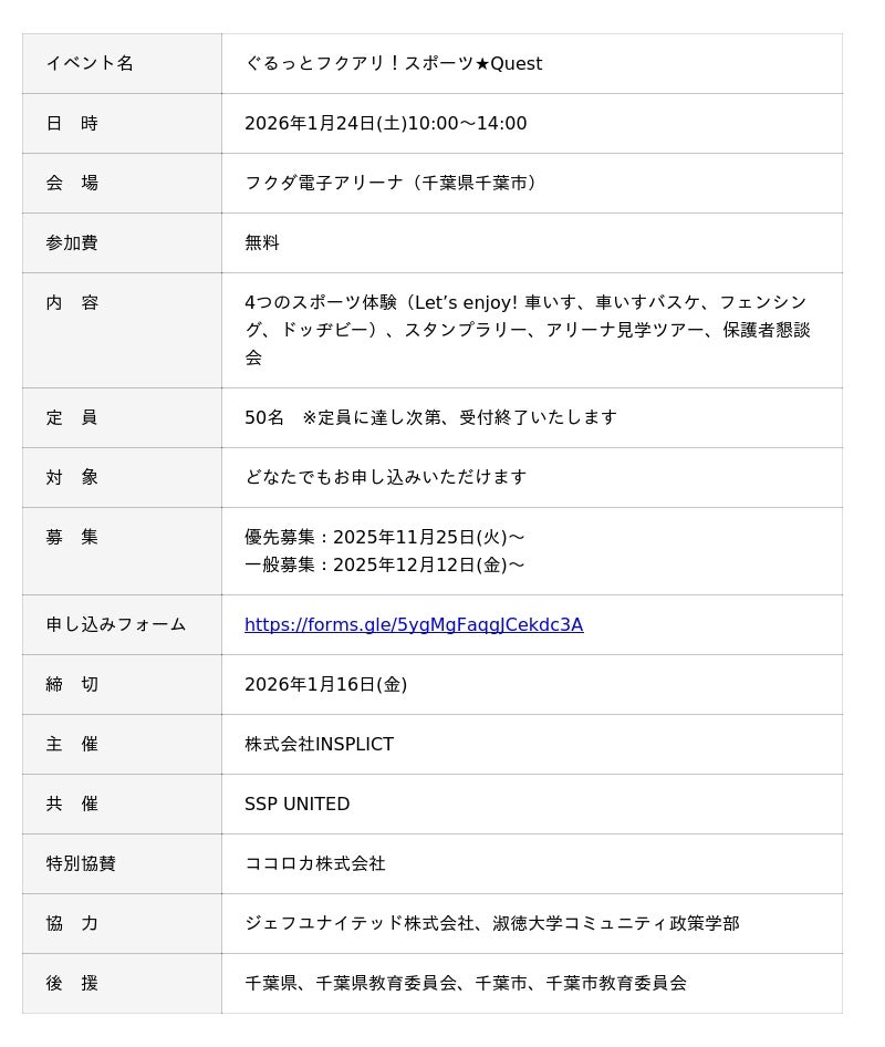 株式会社INSPLICTは、2026年1月24日(土)にフクダ電子アリーナにて、きっかけプロジェクトpresents「ぐるっとフクアリ!スポーツ★Quest」を開催いたします。