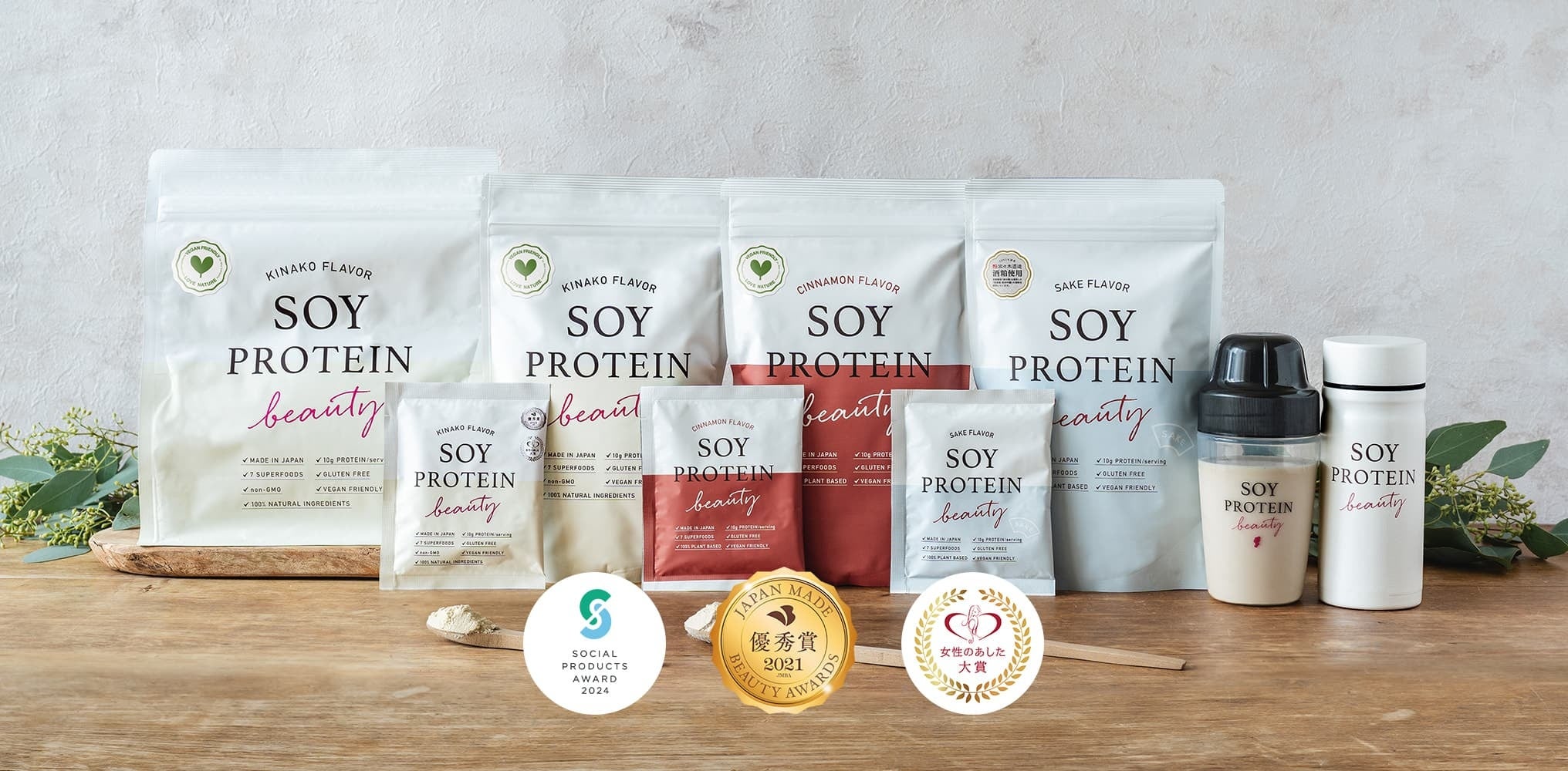 女性の美容と健康維持のための100%植物性のプロテイン。大豆ベースに人気のモリンガやアサイーを含んだ7つのスーパーフードを配合し、普段の食生活だけでは不足しがちな栄養素をバランスよく摂ることができます。きな粉風味で飲みやすく、女性に嬉しい冷え対策素材も入っているので体も温まります。さらにシナモン味・酒粕とコラボしたSAKE味も好評です。ソイプロビューティは美容と健康はもちろん、サスティナブルな健康食品として社会創造を意識して開発いたしました。女性のあした大賞2020受賞、ジャパンビューティアワード2021受賞、ソーシャルプロダクトアワード2022、2024受賞。1食あたり(20gあたり)の栄養素