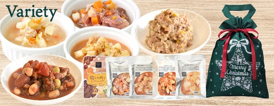 POCHIのレトルトフードをセットにして、クリスマスのラッピングをした特別なパッケージ入り。「バラエティ」と「ミート」、2種類のセットをご用意しました。〇POCHI クリスマスディナーレトルトセット バラエティ【季節限定品】