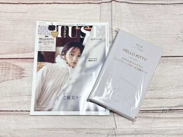2025年11月28日(金)発売の雑誌『otonaMUSE(オトナミューズ) 』2026年1月号には、大人気のHELLO KITTY(ハローキティ)の「ふわふわフェイス&リップストップポーチの2個セット」が付録としてついてきます。