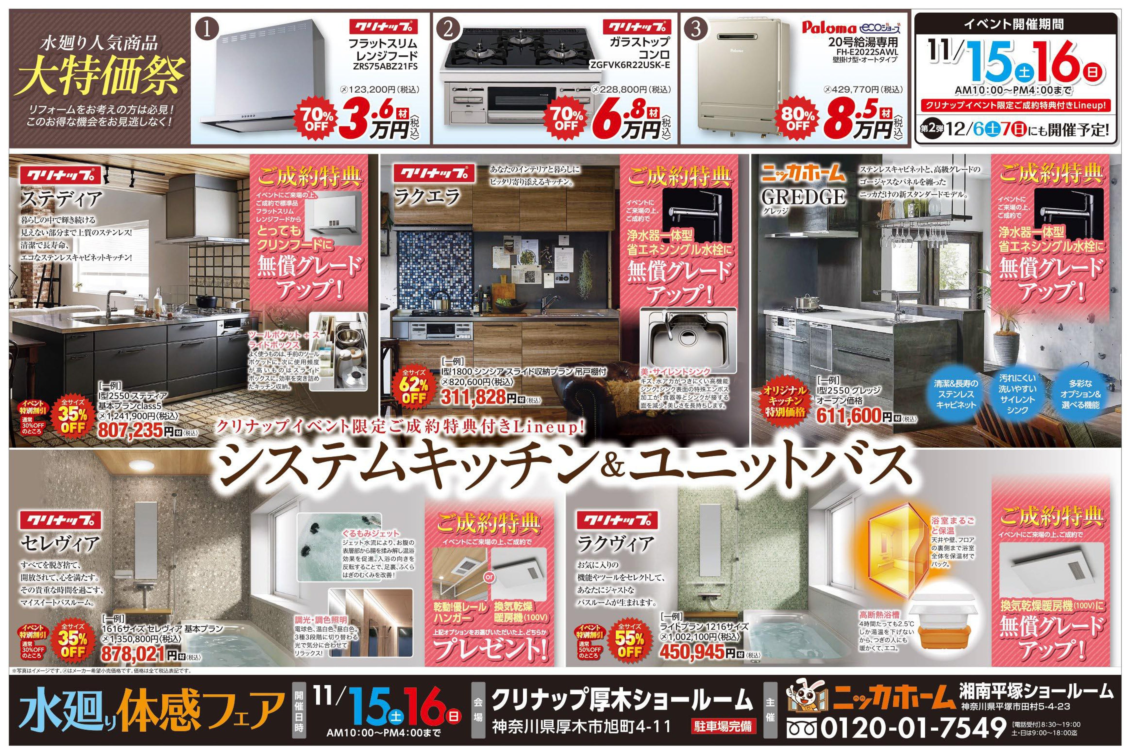 ニッカホーム株式会社(本社:愛知県名古屋市緑区篭山、代表取締役社長:西田裕久、以下 ニッカホーム)の関東支社・ニッカホーム湘南平塚ショールーム が クリナップ厚木ショールームにて「水廻り体感フェア」を開催!