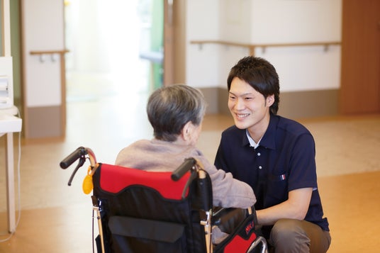 【介護福祉士の仕事】車いすを押して、ブース内のスロープや段差を乗り越えながら、安全に所定の場所まで移動させる仕事をします。また、実際に車いすに乗って、利用者の気持ちを体感します。