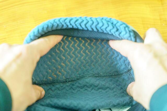 フリース素材が頭部を包み込み暖かさを確保、独自のジグザグ構造が通気性とすばやい吸湿発散性を兼ね備えるという優秀ぶり。