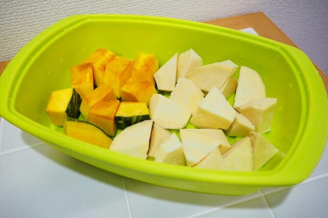 食べたい食材を切って入れ、電子レンジかオーブンレンジで加熱するだけ。