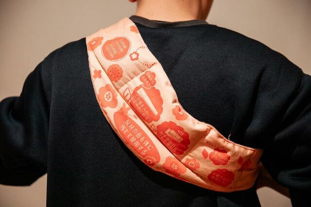 斜め掛けスタイルにすれば、肩や背中まわりも温められ、肩凝りにも効果がありそう。