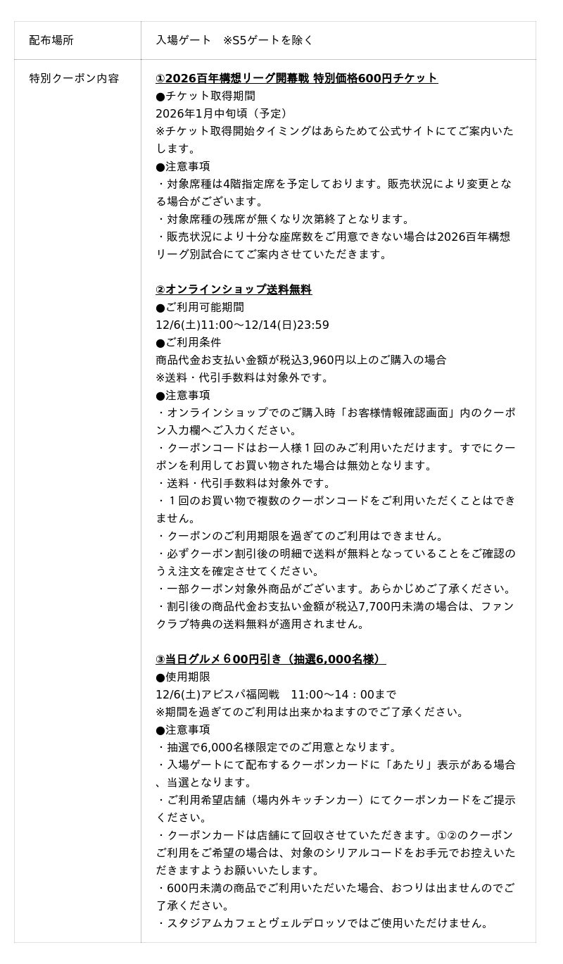 今シーズンご来場いただいた感謝の気持ちと来シーズンもぜひスタジアムへご来場いただきたい想いから、当日ご来場いただいた皆さまにもれなく「特別クーポン」をプレゼントします。ぜひ特別クーポンをご利用ください!