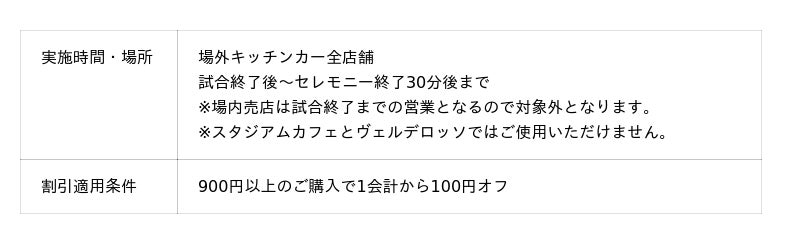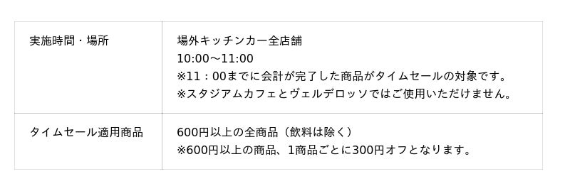 開場1時間前(キックオフ4時間前)から60分間限定で300円オフにてスタジアムグルメをご購入いただけます。