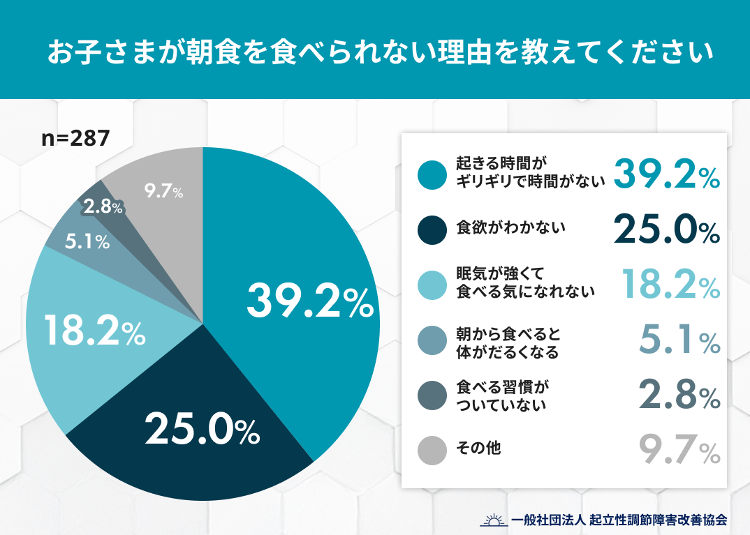 起立性調節障害(OD)やその傾向をもつ子どもの多くが、朝食を十分に食べられず困っているという声が保護者から寄せられています。一般社団法人 起立性調節障害改善協会は、小学生~高校生の子どもを持つ保護者287名を対象に「朝食と起立性調節障害」に関する調査を実施。その結果、約8割の子どもが毎日またはだいたい食べられている一方で、起床時の体調不良により食欲低下や時間不足に悩む家庭も多い実態が見えてきました。食べられない理由や、家庭で行われている工夫、理想の朝食像などを通じて、子どもの“朝のつまずき”に寄り添うヒントが浮かび上がります。