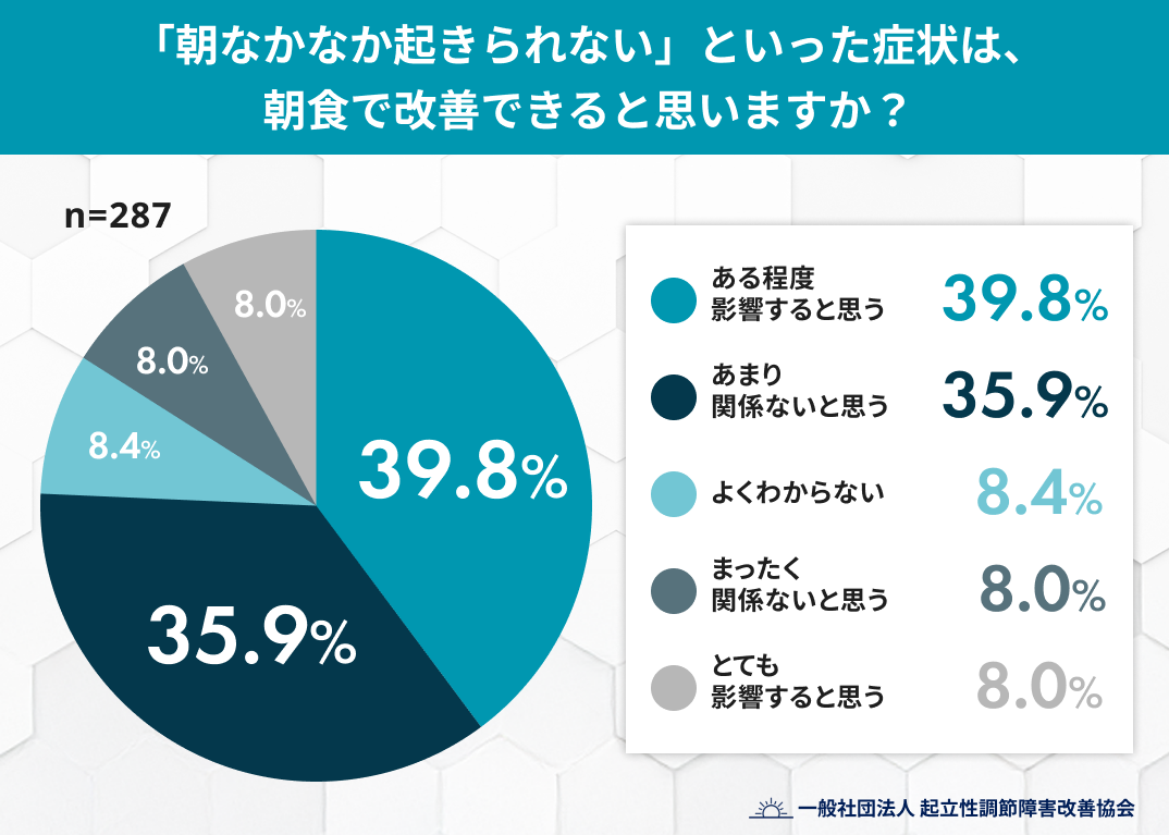 - 朝食による改善効果については「ある程度影響する」39.8%と、一定の期待を寄せる声が多数