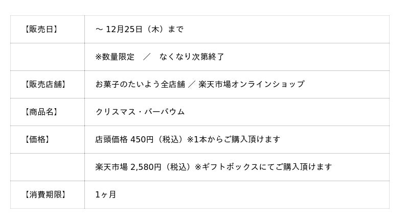 株式会社太陽社(所在地:千葉県匝瑳市飯倉293、代表取締役:片岡正裕)が展開する千葉県で長年愛される菓子店「お菓子のたいよう」は、クリスマススイーツ第4弾として、大ヒットを記録した「ハロウィン・バーバウム」のクリスマス限定版『クリスマス・バーバウム』を11月30日(日)より発売いたします。