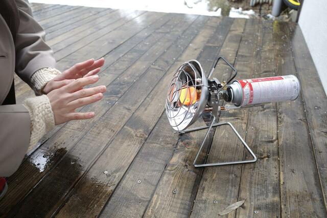 撮影日は雪が積もるほど寒かったのですが、「Iwatani FORE WINDS アウトドアヒーター」に当たっていれば、そこそこ暖を取れました。