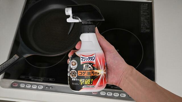 今回登場した泡スプレーは、コンロや五徳、グリル、レンジフード、換気扇のほか、フライパンや鍋の裏にも使えるとのこと。