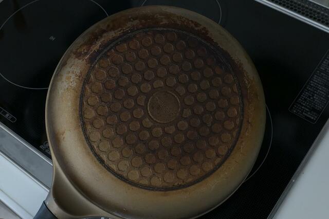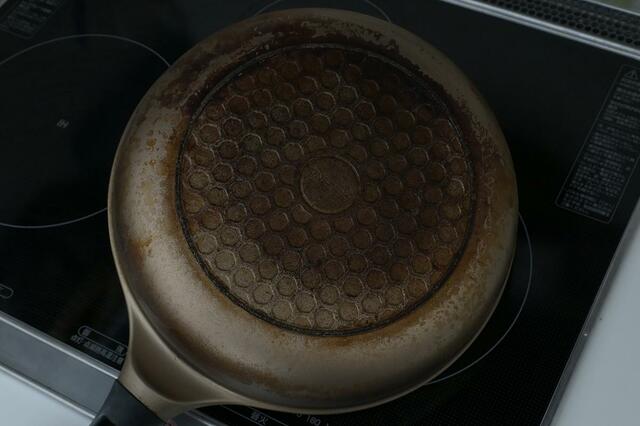 流石に長年使っているフライパン、もう炭化してしまっていたのか、底の部分のコゲはかなり残ったまま……。
