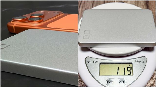 厚みは「iPhone 17 Pro」とほぼ同じ約8.7mmで、重量も実測値でわずか119g(公式サイトの情報では約121g)。iPhone 17 Proのおよそ3分の2程度の軽さです。