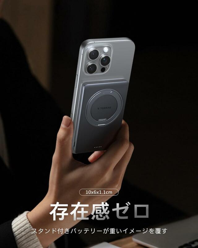 TORRASの「MiniMag Ostand」は、薄さ1cm・重さ126g・容量5000mAhという持ち歩きやすさに加え、13.8Nの強力マグネットと360°回転スタンドを備えた多機能バッテリー。持ち運びしやすいスタンド機能付きモバイルバッテリーを探している人にぴったりの一台です。