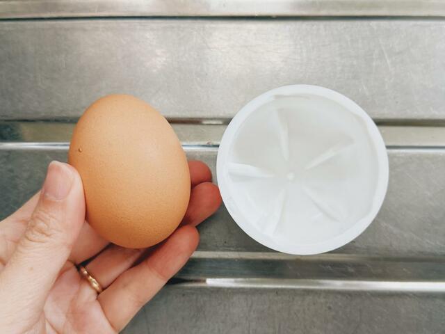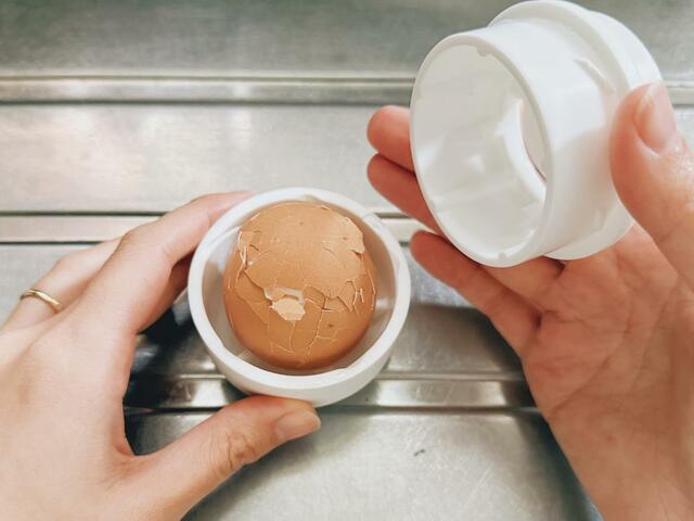 卵みたいな丸みのあるフォルムで、見た目もかわいい。どのサイズの卵にも使えます。