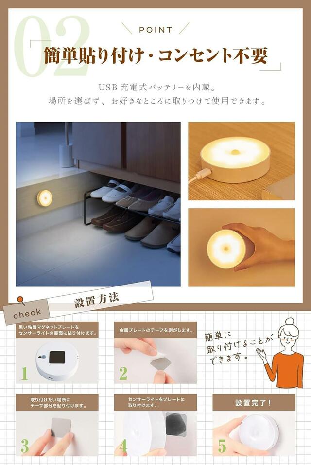 設置方法は、付属の金属プレートを取り付け位置に貼り、そのプレートに合わせてライトをくっつけるだけ。ライトの裏にはマグネットが取り付けられているので、このプレートを使わなくても、マグネットがつく扉につけても良さそうです。
