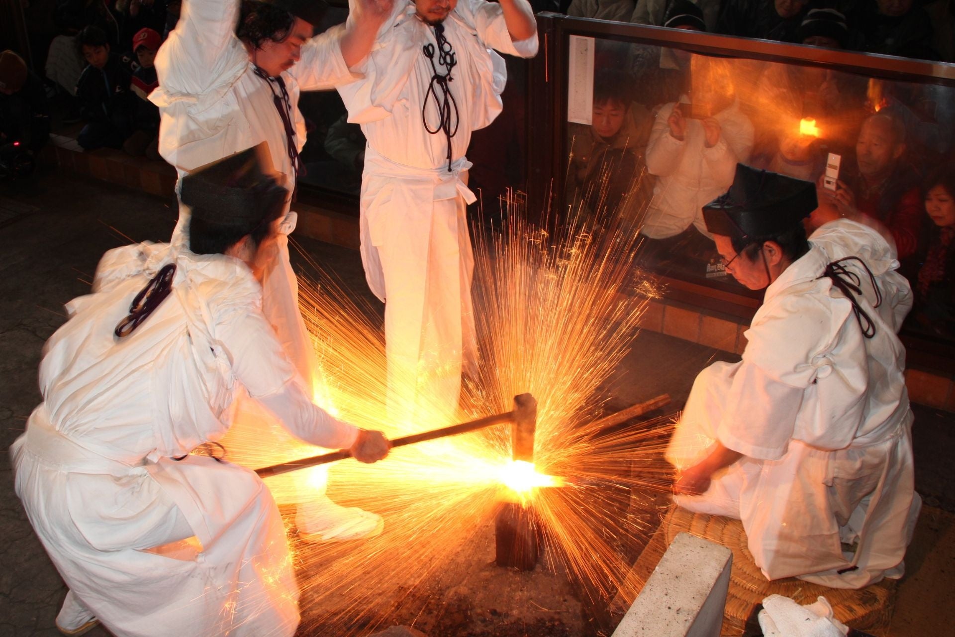 古式の技法を受け継ぐ匠たちが行う日本刀鍛錬の様子を見学できる施設です。熱した鋼を打っては折り折っては打つ様を見ることができ、その火花飛び散る光景は圧倒的です。