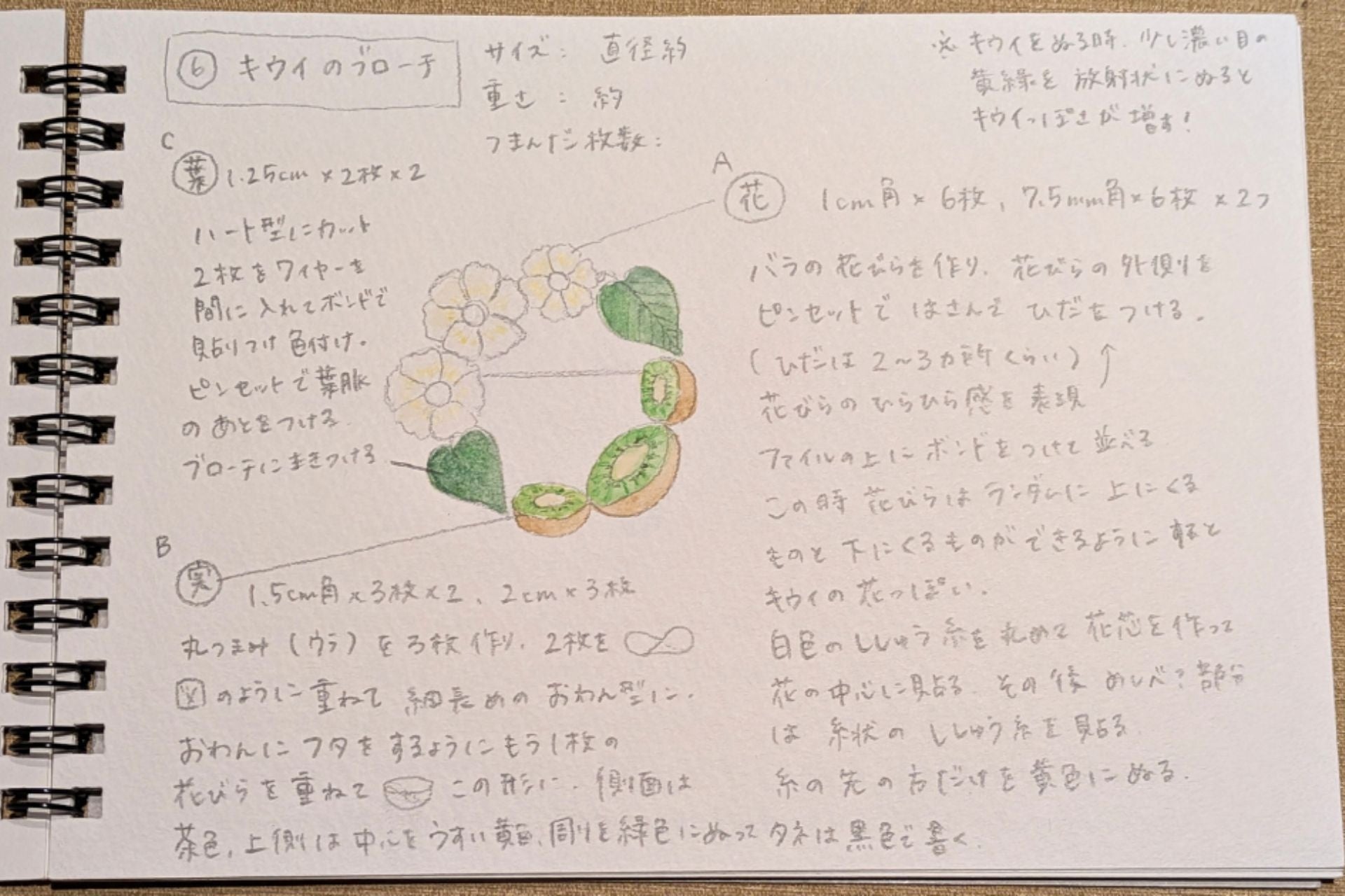 この作品は、そんな「ほらどキウイ」の実・葉・花の姿を、つまみ細工の技法で表現したものです。