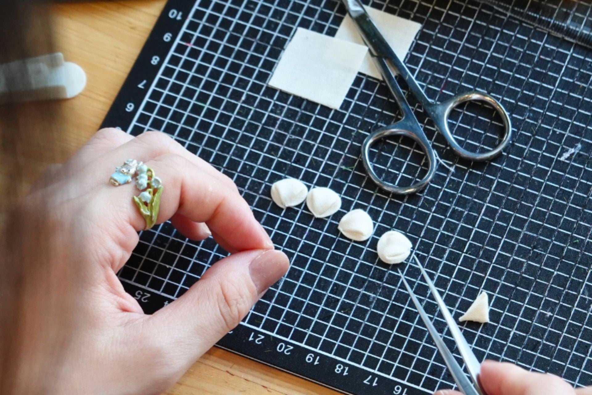 ほらどキウイの花・実を実際に観察し、スケッチを重ねながら、花弁の形や花芯・構造・色合いまで忠実に再現し、心を込めて丁寧に制作しています。”こびと“の視点を通して、自然と人の距離をそっと近づけて、日常に小さな気づきと学びを育むことが願いです。