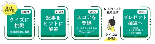 STEP1~3を繰り返して全6回のクイズに高得点を登録しましょう!全6回の最高スコアの合計(30点満点)で、25点以上の信毎ID会員がプレゼントの抽選対象です。