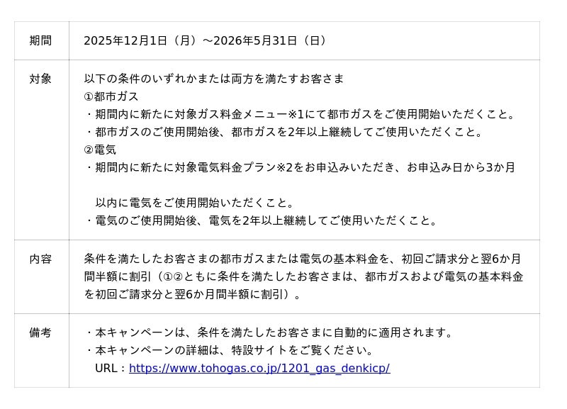 東邦ガスグループは、岡田将生さん・井上咲楽さんが出演する新CMの放送を、本日12月1日(月)から開始します。当社グループは、ガス事業を通じて提供してきた安心に加え、くらし・産業の両面で未来につづく「賑わい」を創出し、誰もが住みたい地域をつくることを目指し、挑戦を続けています。その挑戦の姿勢をCMに込め、広く皆さまにお伝えするための各種プロモーションを、12月1日から順次開始します。また、新CMのリリース日と同日から、新たに当社の都市ガスまたは電気をご使用いただくお客さまを対象にしたガス・電気の料金キャンペーンを開始し、新CMと連動したキャンペーンCMも展開いたします。