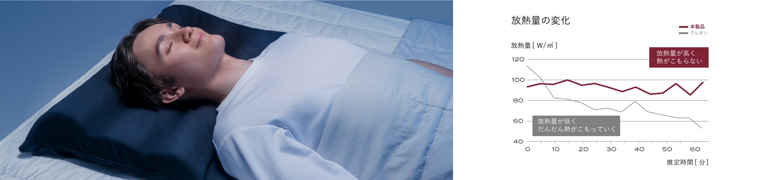 良質な睡眠を得るためには、寝床内の温度と湿度を適正に保つことが重要です。通気性のよい素材が頭部の熱を放熱し、深い眠りへ導きます。90%以上が空気層でできているので睡眠時に発生する熱や湿気がこもらず睡眠に最適な温度・湿度をコントロールし、快適な睡眠環境をつくります。ウレタン素材やフェザー素材の枕と比較して格段に優れる通気性の良さで朝まで快適に眠ることが出来ます。