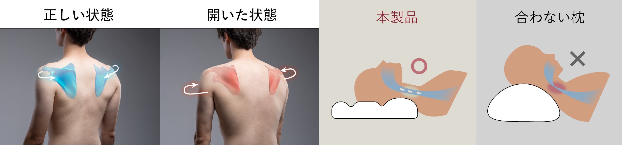 睡眠中に肩甲骨まわりをストレッチ。左右の肩甲骨を寄せ、長時間の前かがみ姿勢で硬くなった肩甲骨まわりの筋肉にアプローチします。首の理想的なカーブと肩甲骨の安定した位置により、胸郭が自然に広がって気道が開き、リラックスした呼吸へと導きます。