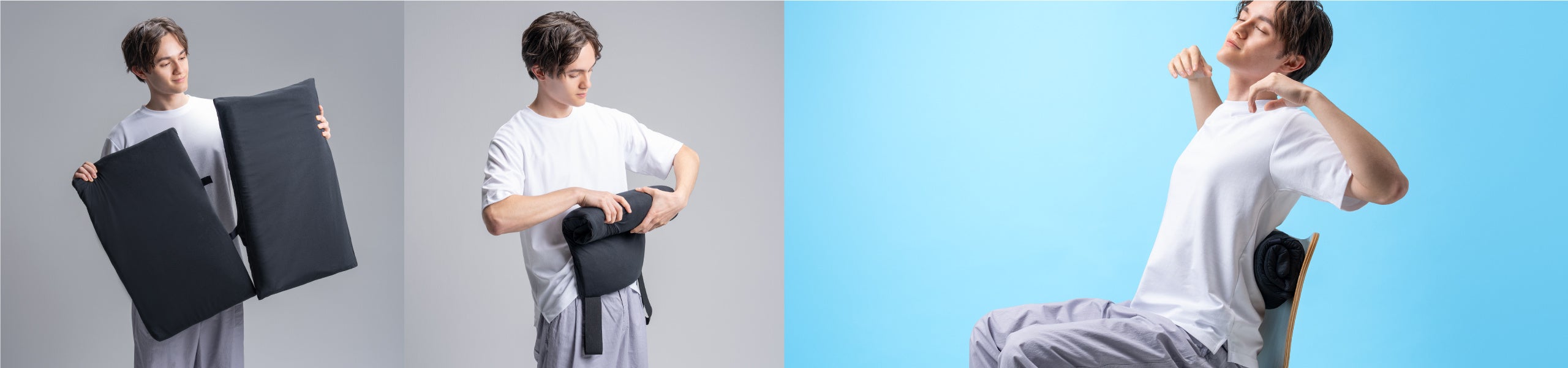 長時間のデスクワーク、PC・スマホ使用による前かがみ姿勢で開いた肩甲骨や、緊張状態の筋肉を和らげ、心地よく緩めることで快適な位置で支えながら自然なバランス状態へ導きます。