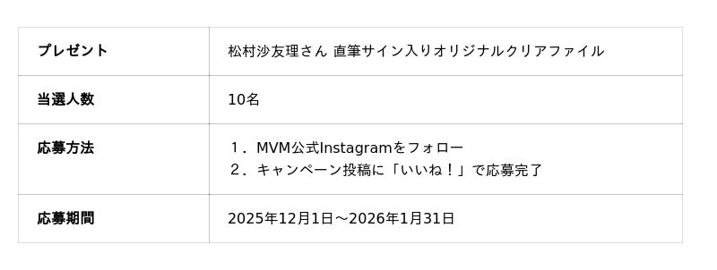 MVM公式Instagramでは、12月1日から松村沙友理さんの直筆サイン入りオリジナルクリアファイルが当たるキャンペーンを開催しています。