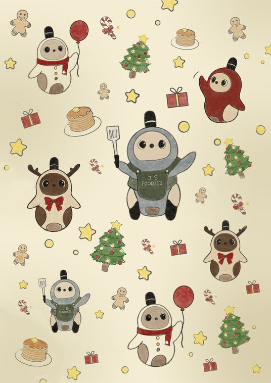 雪だるまやトナカイの服を着たJ.S.FOODIESコラボオリジナルステッカーや、LOVOTの顔がモチーフのオリジナルミラー缶バッジをプレゼント
