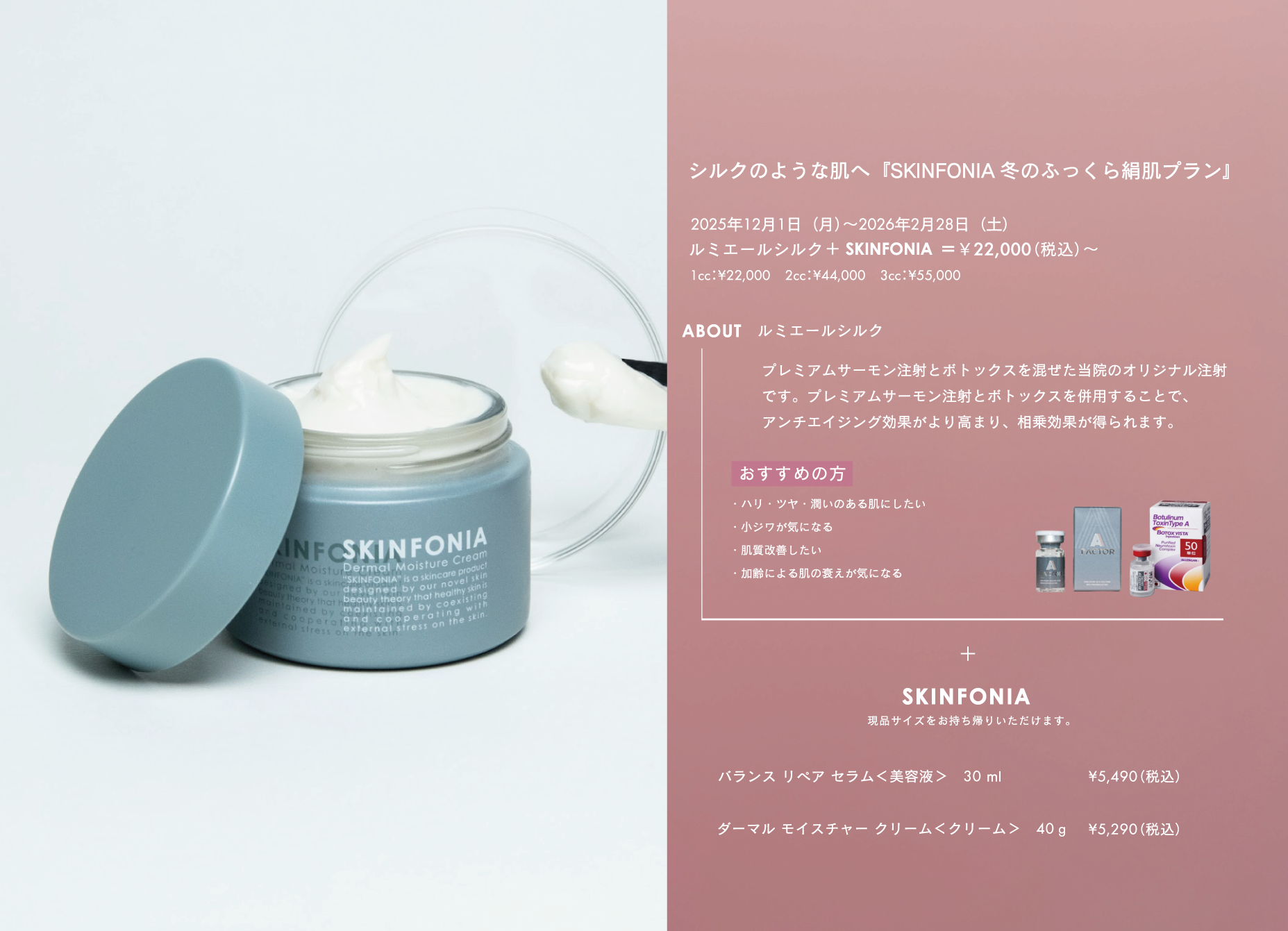 冬に不足しがちなハリとしなやかさを引き出す施術と、うるおいを保つスキンケアを同時に体験できる季節限定プランとして、肌の外側から”整えるケア”と、内側から”育てる治療” を組み合わせたサービス、「SKINFONIA 冬のふっくら絹肌プラン」を販売いたします。