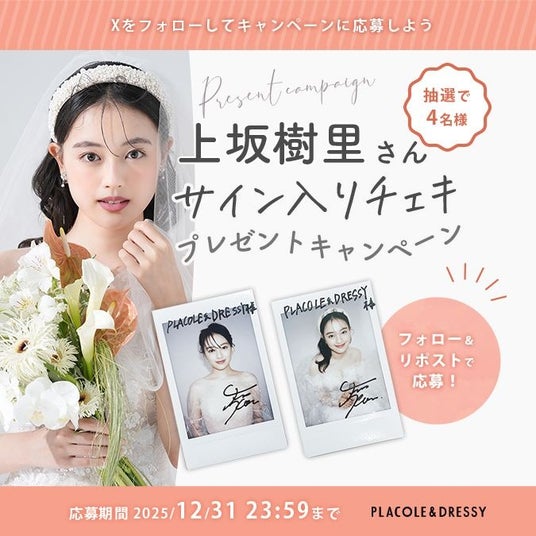 「PLACOLE & DRESSY」ブランドを展開する、冒険社プラコレ(本社:神奈川県鎌倉市、代表取締役CEO:武藤功樹)は、ウェディングドレスをもっと身近に楽しんで欲しいと考え「ウェディングドレスに憧れるすべての人へ」PLACOLE&DRESSYが贈る、特別コンテンツをスタート。2025年12月は俳優 上坂樹里さんを迎え、メッセージを頂きました。
