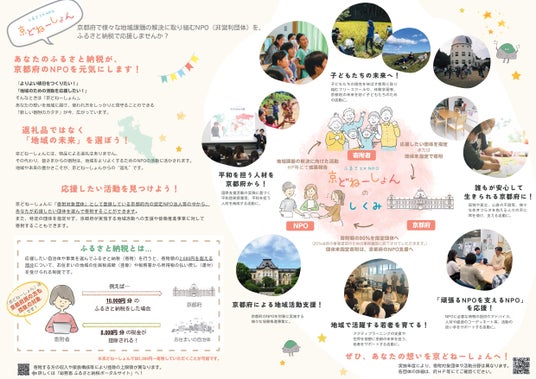 ■京都府では、9月からふるさと納税によりNPOを応援する「ふるさと×NPO 京どねーしょん」(京都府ふるさと応援府民協働推進事業)を開始しました。