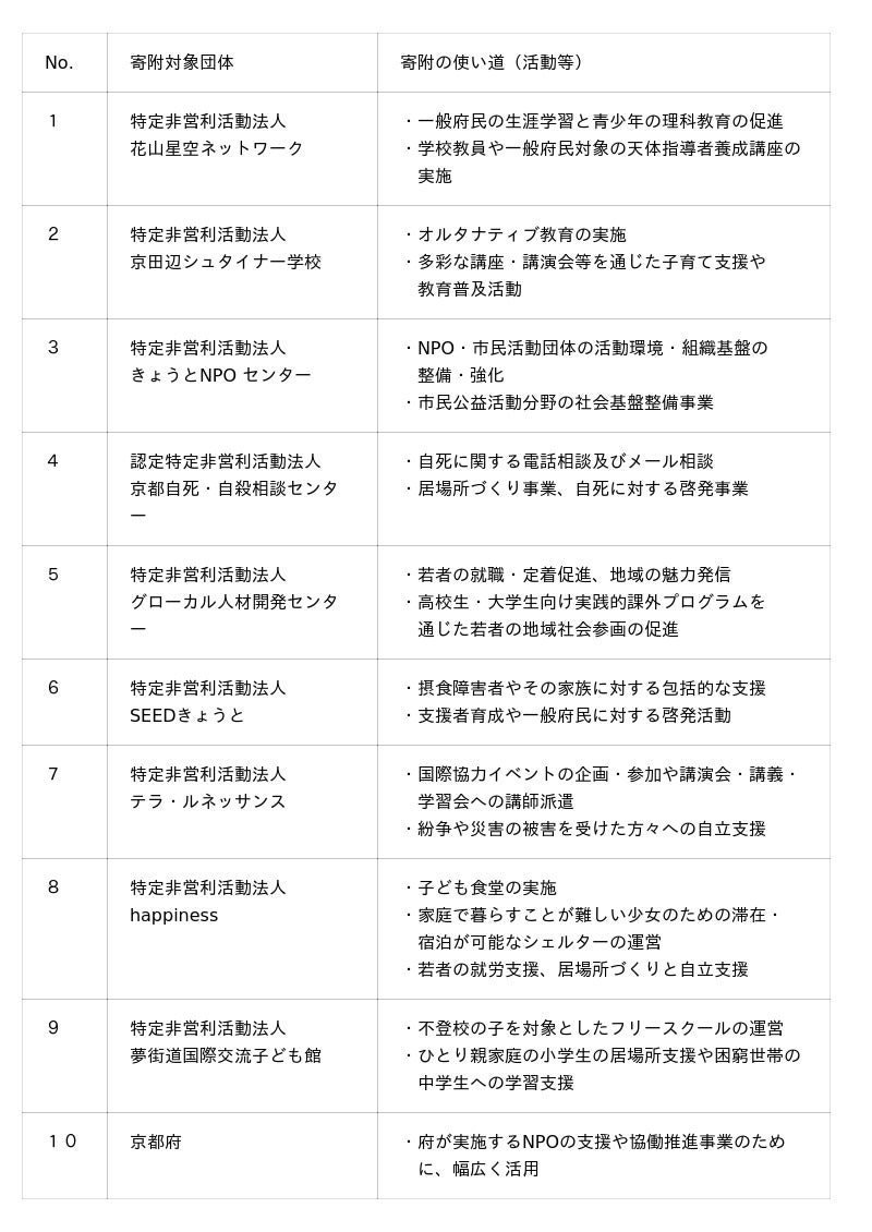 ふるさと×NPO 京どねーしょん(京都府ふるさと応援府民協働推進事業)寄附対象団体一覧
