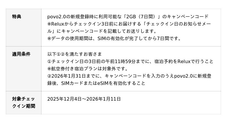 KDDI、沖縄セルラーは2025年12月4日から、宿泊予約サービス「Relux」で宿泊ご予約いただいたお客さまを対象に、povo2.0の新規登録時にご利用いただける「2GB(7日間)」をプレゼントするキャンペーンを実施します。