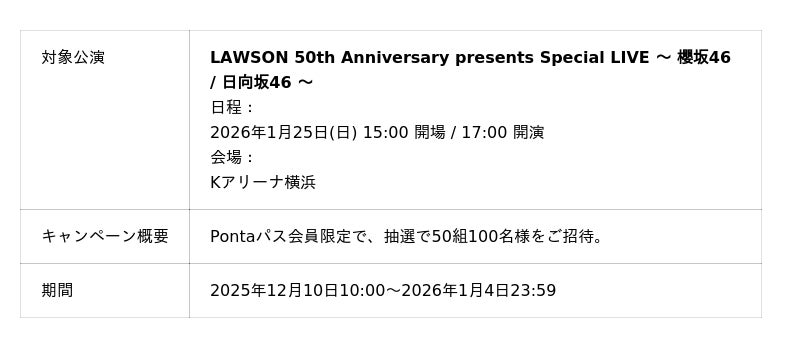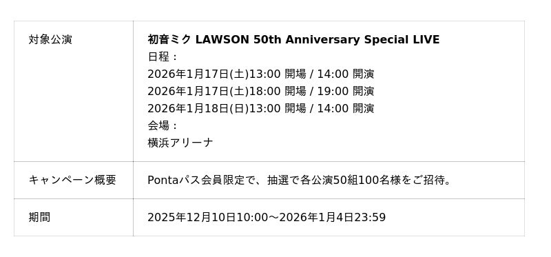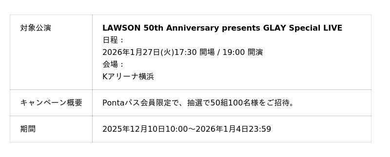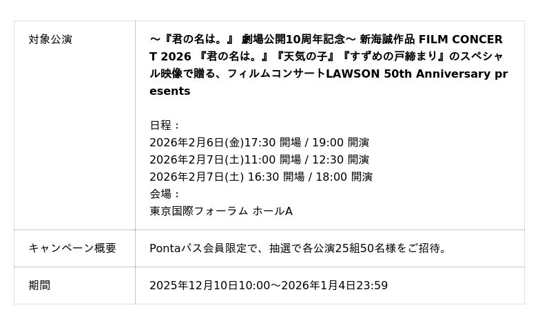 この度「Pontaパス エンタメぽんぽんBOX」では、Pontaパス会員限定で、初音ミク、=LOVE・≠ME・≒JOY、櫻坂46 /日向坂46、GLAYといった人気アーティストのライブや、「~『君の名は。』劇場公開10周年記念~新海誠作品 FILM CONCERT 2026」などの公演に招待するチケットプレゼントを実施予定です。抽選で、合計375組750名様のPontaパス会員をご招待いたします。