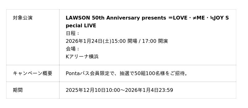 KDDIは、約1,500万人が利用しているおトクなサブスクリプションサービス「Pontaパス」(月額548円)で、映画割引やイベント招待など、会員向けエンタメサービスがまとめて楽しめる「Pontaパス エンタメぽんぽんBOX」の開始を記念して、豪華ライブ・公演にPontaパス会員をご招待するキャンペーンを実施します。