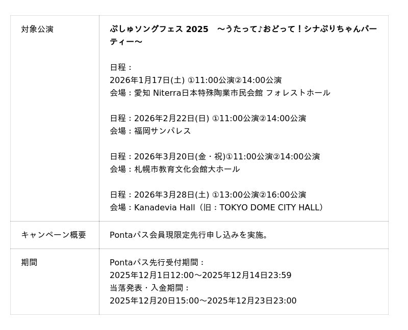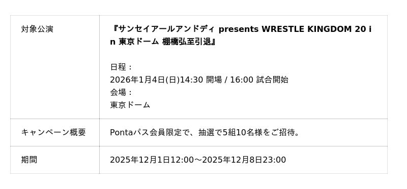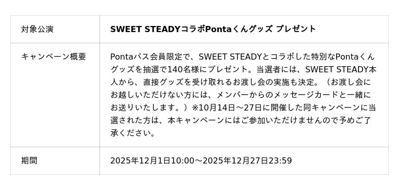 また、全席種が即完売し急遽増席分の販売が発表され話題なっている『サンセイアールアンドディ presents WRESTLE KINGDOM 20 in 東京ドーム 棚橋弘至引退』のご招待や、人気テレビ番組「シナぷしゅ」の5周年を記念したイベント『ぷしゅソングフェス 2025 ~うたって♪おどって!シナぷりちゃんパーティー~』のPontaパス会員限定の先行申し込み、KAWAII LAB.所属のアイドルグループ・SWEET STEADYとコラボした特別なPontaグッズのプレゼントキャンペーンなど、様々な会員限定キャンペーンを実施します。今後も、お客さまが「Pontaパスに入っていてよかった」「使っていてよかった」と思っていただけるような、さまざまなサービスやコンテンツを提供していきます。