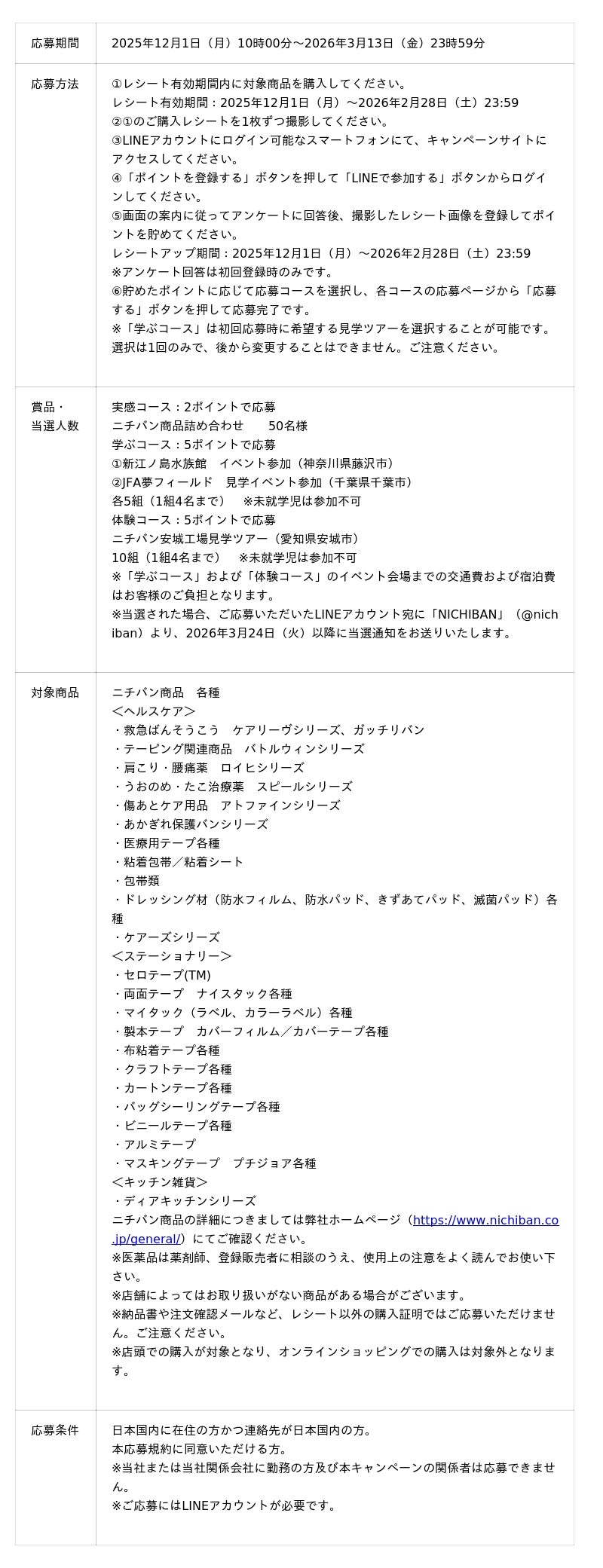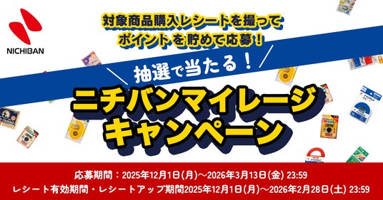 ニチバン株式会社(本社:東京都千代田区、代表取締役社長:高津敏明)は、ニチバン商品の購入レシートを撮影して、ポイントを貯めて応募すると、抽選でスペシャルイベントやニチバン商品詰め合わせが当たる「ニチバン マイレージキャンペーン」を2025年12月1日(月)より開始いたします。