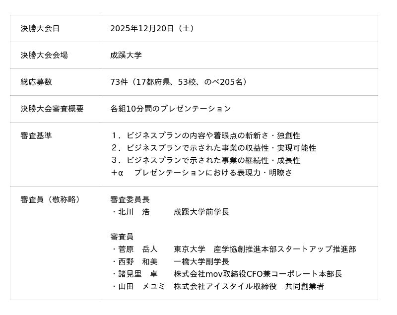 成蹊大学(東京都武蔵野市、学長 森 雄一)は、次世代の起業家精神を育むことを目的に「高校生ビジネスプランコンテスト2025」を初開催します。決勝大会では、全国73チームから選ばれた高校生8チームが、高校生ならではの柔軟な発想で社会課題解決に挑むビジネスプランを発表し、競い合います。