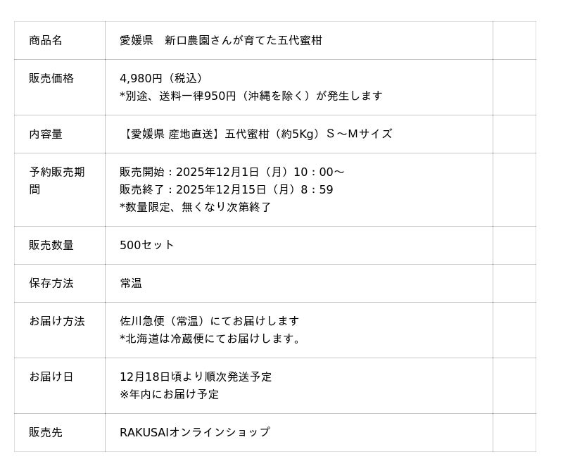 d130004-116-c3ecf9fb32210fde84eabb5775cecf0e.pdf 楽彩株式会社(本社:東京都足立区/代表取締役社長:大崎善保)は、年末の産地直送企画として、愛媛県・新口農園の『五代蜜柑(ごだいみかん)』の予約販売を2025年12月1日(月)より開始いたします。五代にわたり土地、歴史、文化を継承してきた新口農園が育てる本商品は、濃厚な甘みと心地良い酸味のバランスが特徴です。生産者の想いが詰まったこだわりの箱みかんを、年末年始の団らんのひとときに産地直送でお届けします。